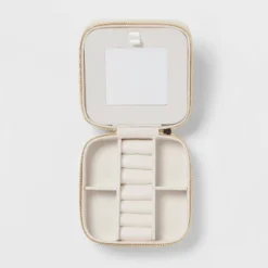 Keep your travel essentials updated in chic style with this Small Travel Accessory Organizer from Brightroom™. This small accessory organizer is designed in a square shape with curved sides and multiple interior divided compartments to stash away your rings, earrings and other accessories. The gold-tone zipper closure complements the faux-leather construction for luxe charm and the mirror inside makes it easy to accessorize. Compact enough to carry in a bag, this ivory accessory organizer is great for your own use or gifting to a loved one.